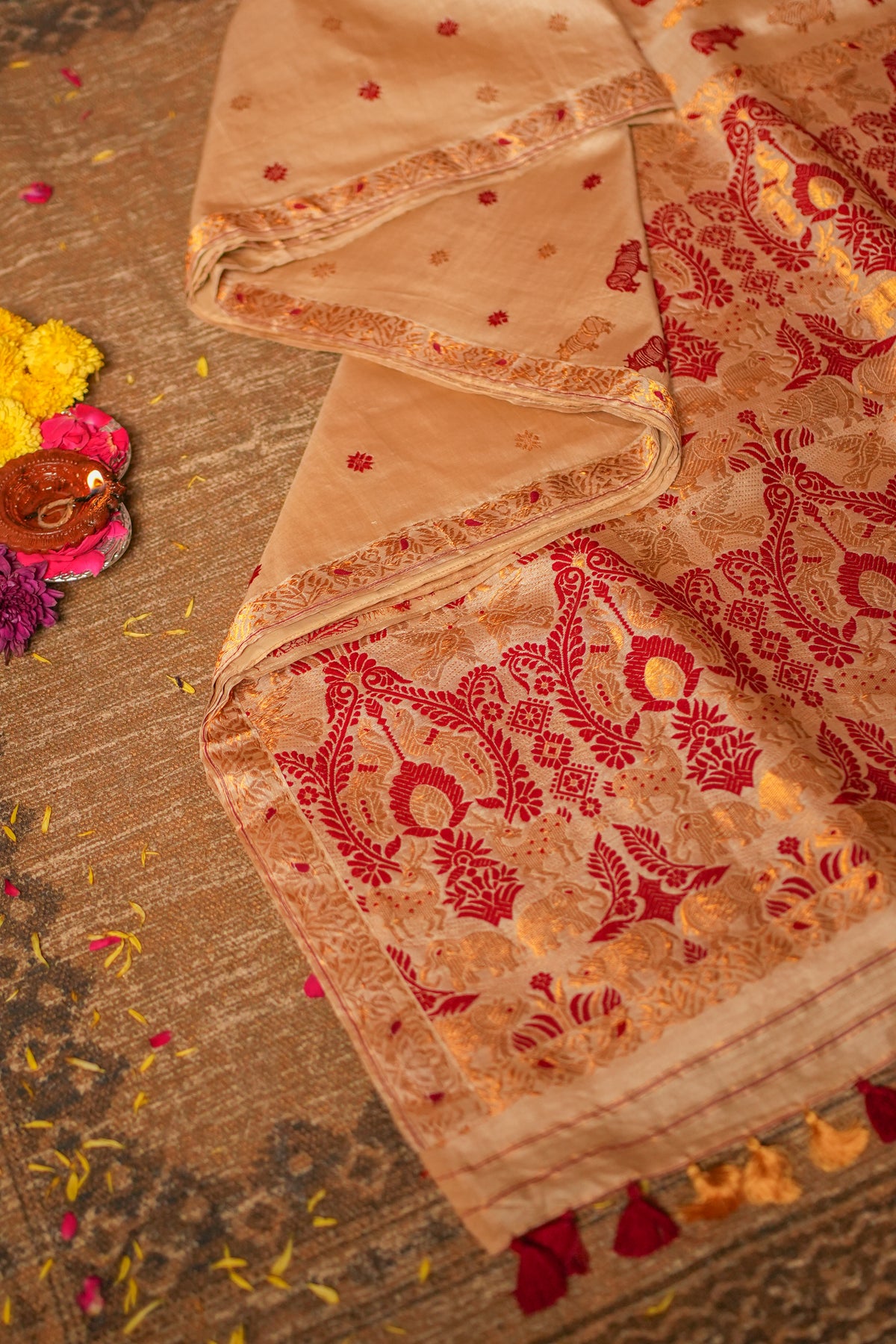 Immerse yourself in the charm of Assam’s wilderness with this Kaziranga-inspired pure tussar silk saree. Woven in rich golden tussar silk, this masterpiece celebrates the heritage of Assamese craftsmanship and the beauty of Kaziranga’s flora and fauna — from majestic wildlife motifs to intricate forest-inspired patterns.