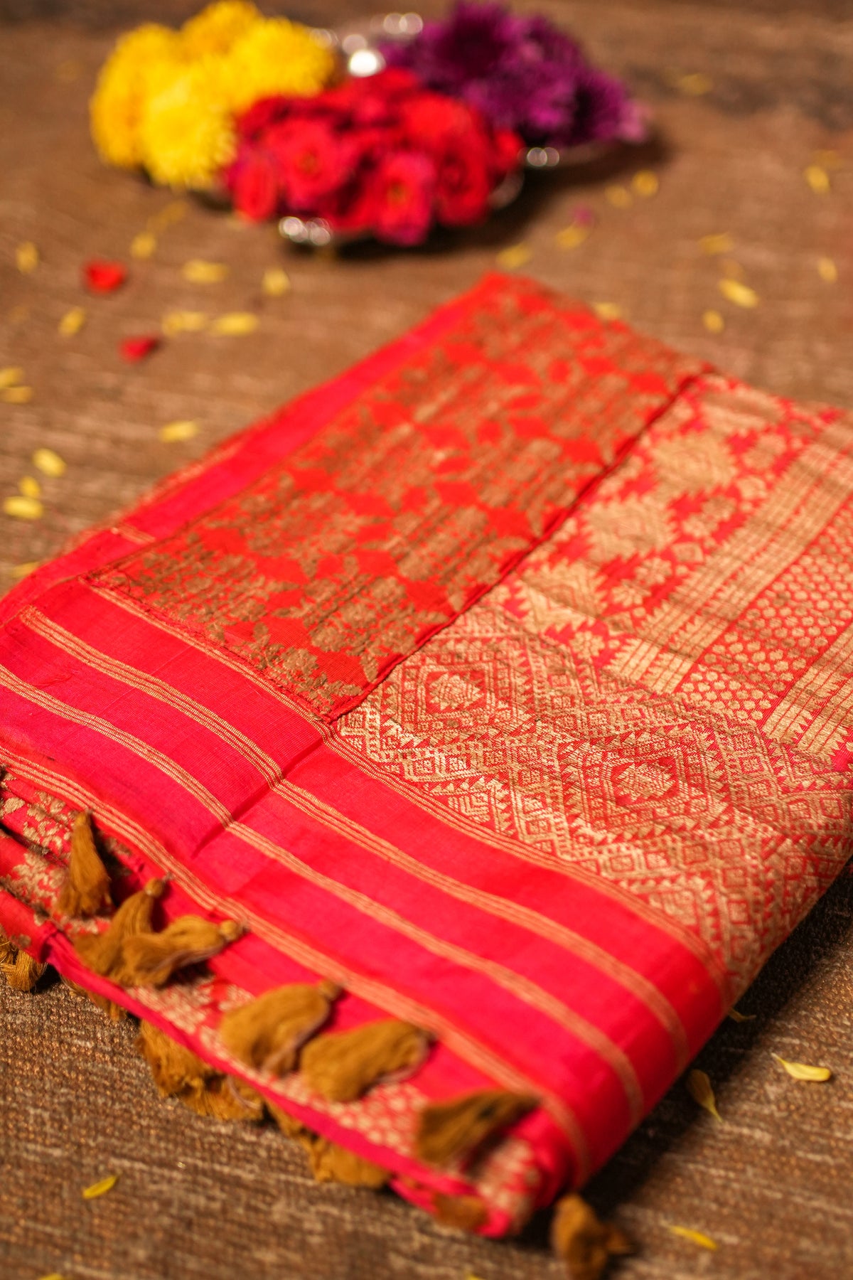 The saree’s floral big buta borders and intricate woven motifs lend it a rich, regal appeal, making it a perfect pick for weddings, festive occasions, and cultural gatherings. The vibrant crimson hue contrasts exquisitely with the golden detailing, while the natural fragrance and texture of the raw silk add to its authenticity.