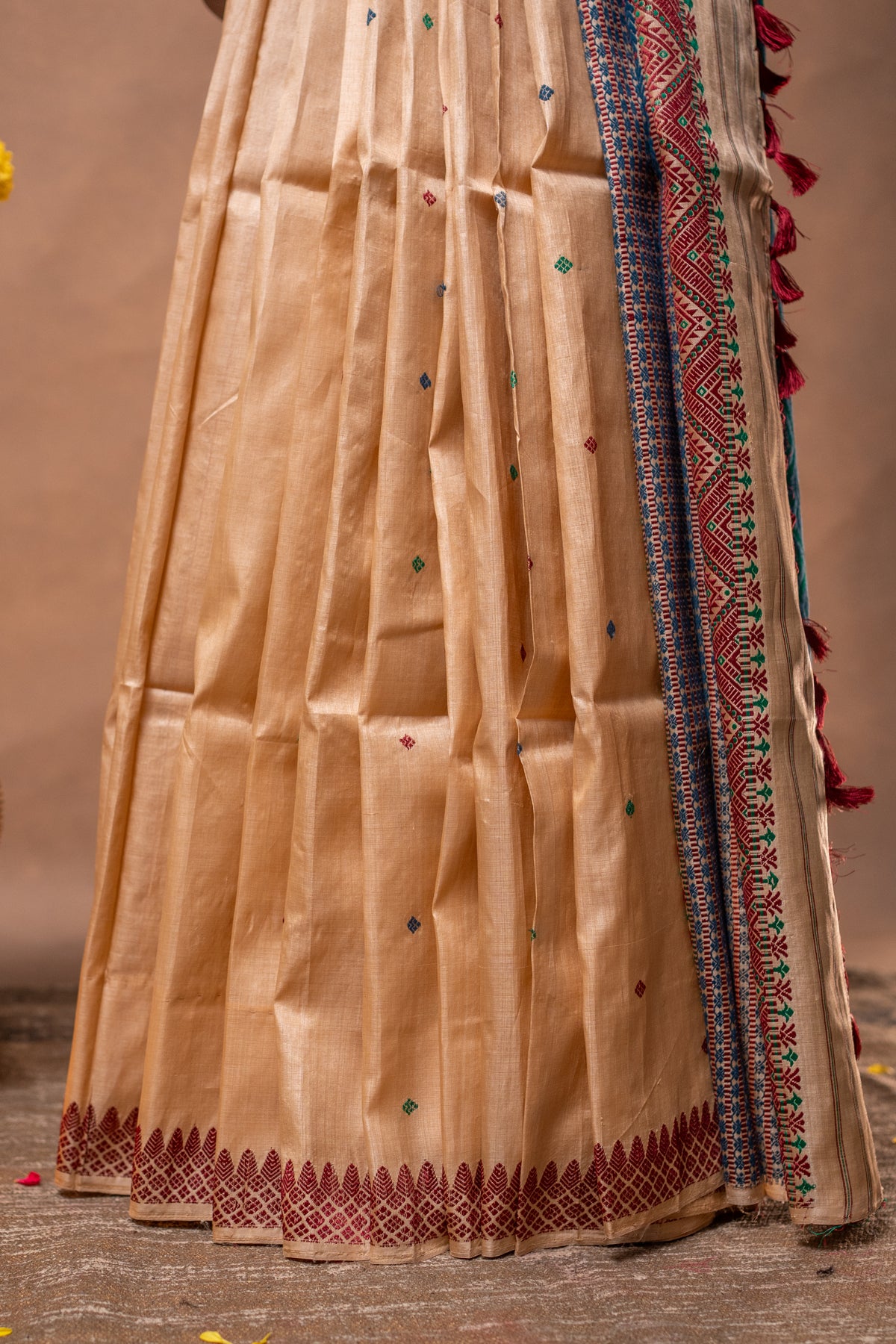 Celebrate the spirit of tradition with this exquisite Assam handloom pure tussar silk saree, also known as Tossmuga. Renowned for its natural sheen, rich texture, and strength, this saree is a fine example of Assamese weaving heritage.