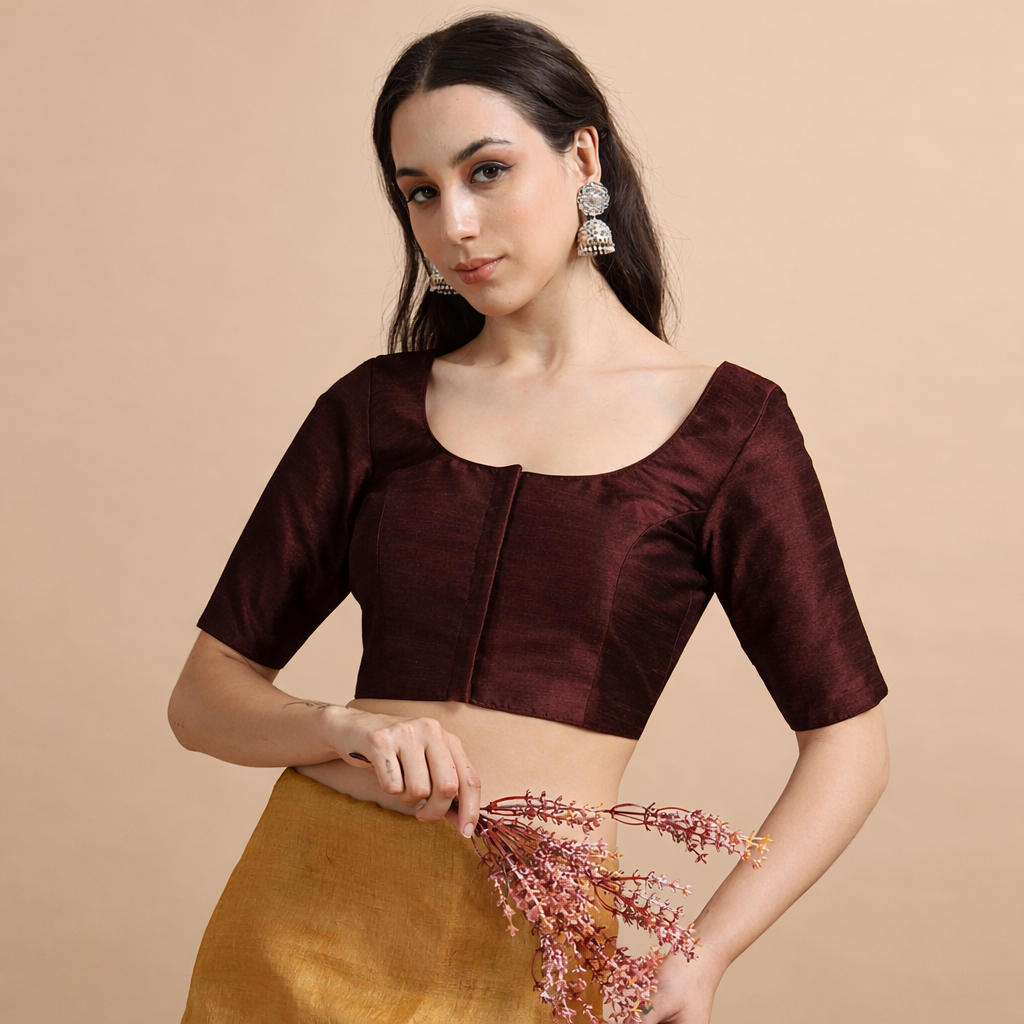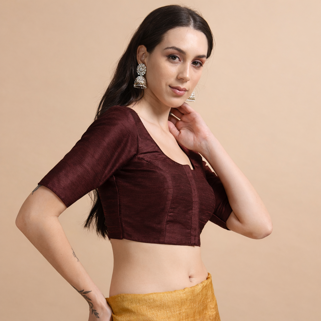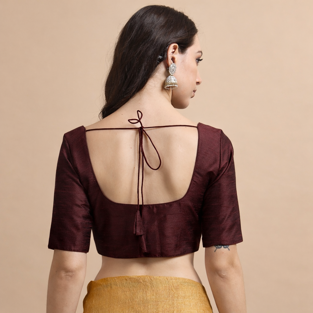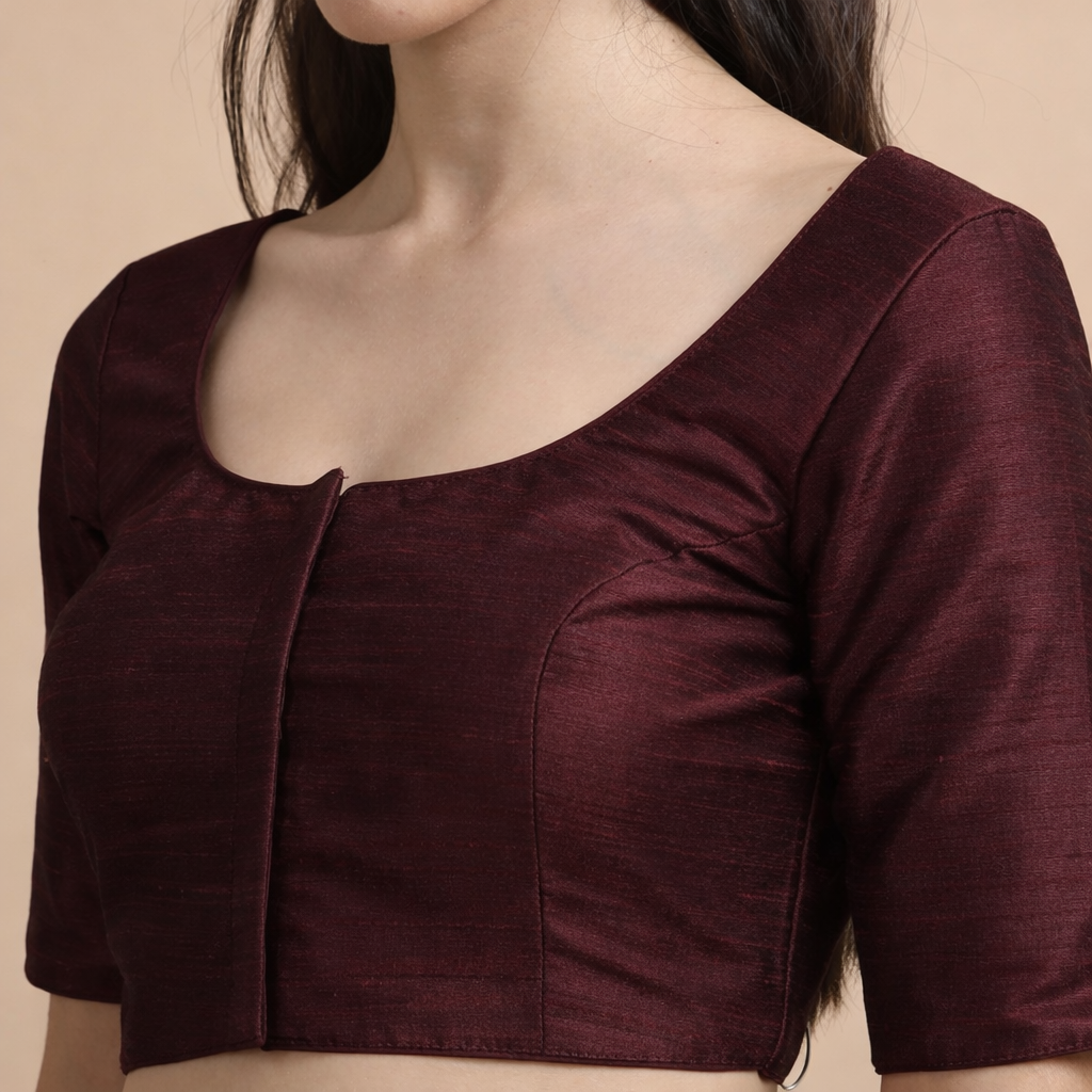 Dark Maroon Readymade Raw Silk Saree Blouse with Elbow Sleeves & Deep Back
