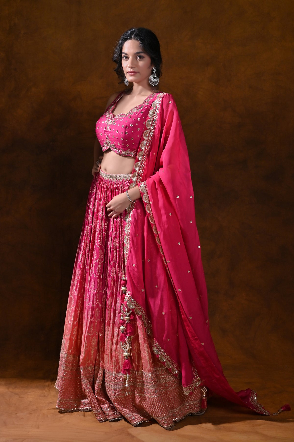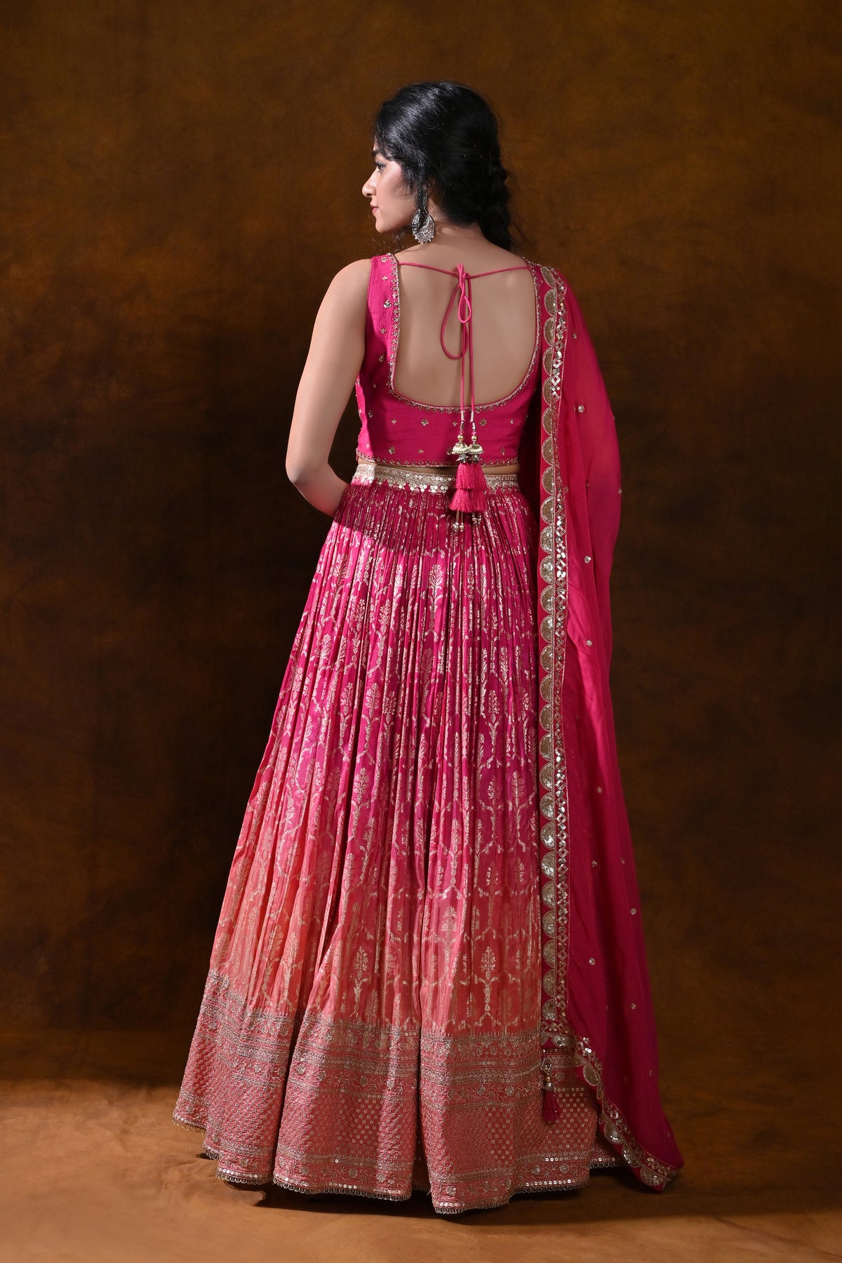 - Color & Gradient: Delicate pink-to-orange ombre across the lehenga for a luminous, festive presence.