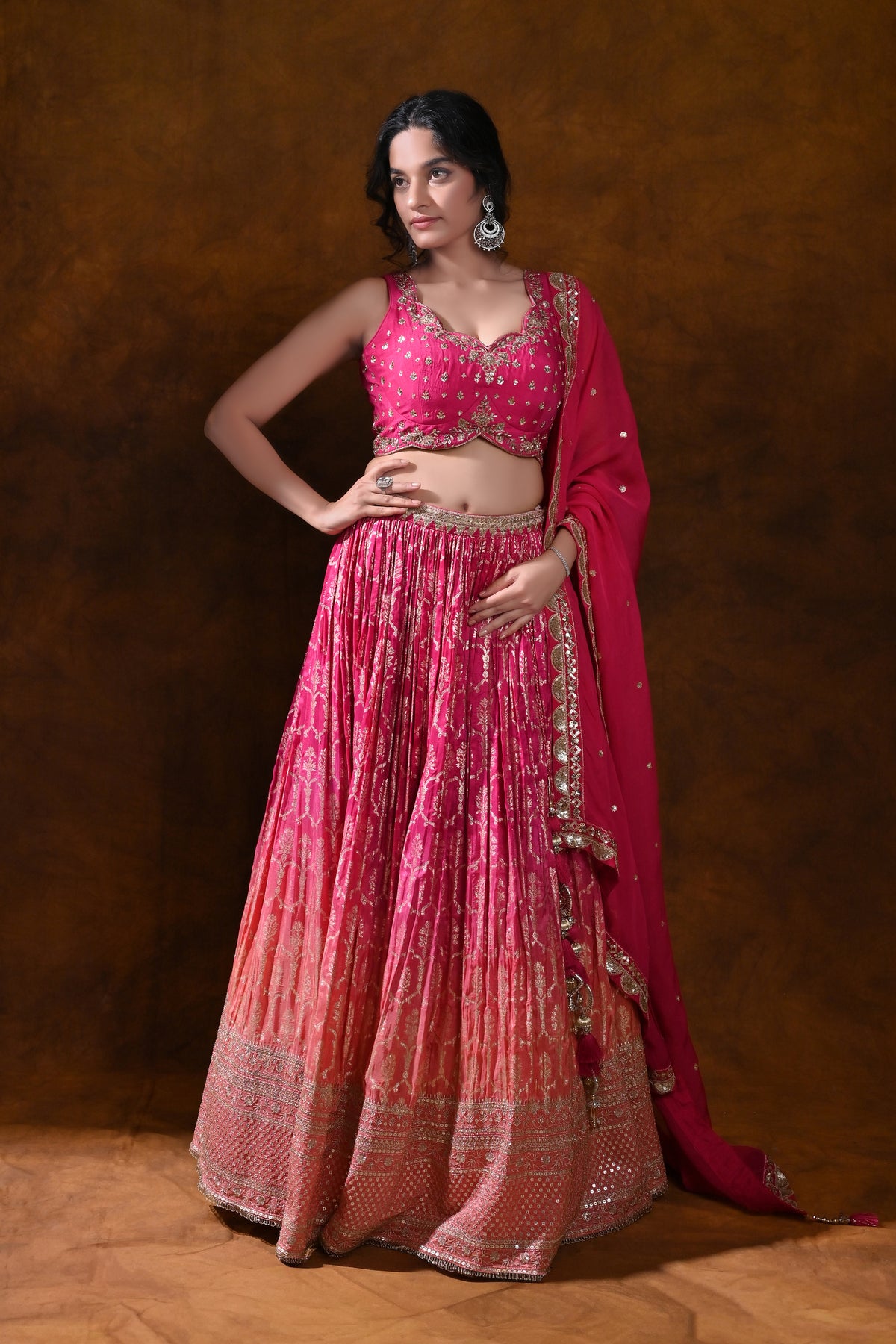 Step into the spotlight with this Pink and Orange Ombre Lehenga, a wedding-ready ensemble designed for celebrations that demand a memorable, elegant look. Crafted for those who treasure traditional craftsmanship with a modern, vibrant twist, it pairs a richly embellished blouse and a sweeping ombre skirt with a coordinating dupatta for a cohesive, photo-ready ensemble.