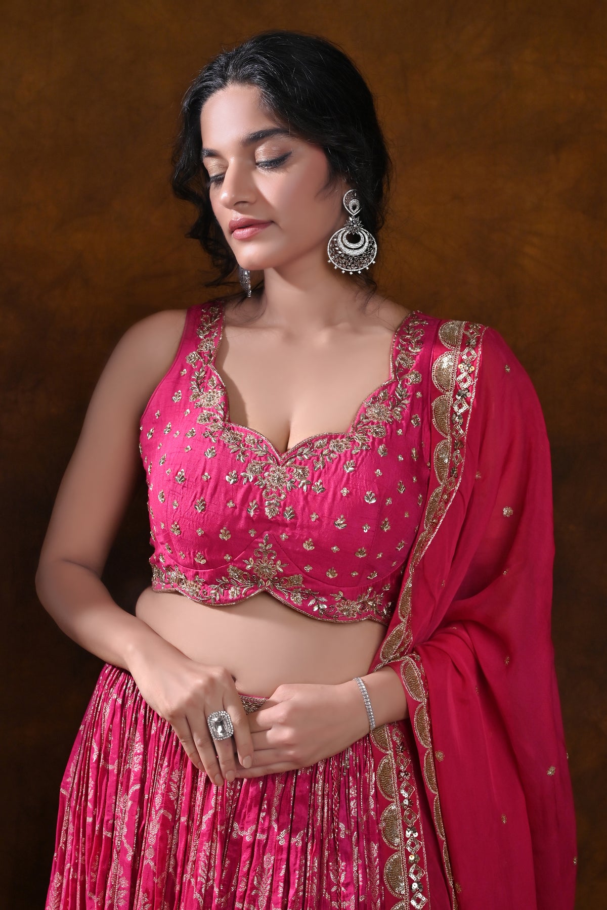 - Dupatta & Draping: Matching magenta dupatta with an ornate gold border and subtle embellishments to complete the look.