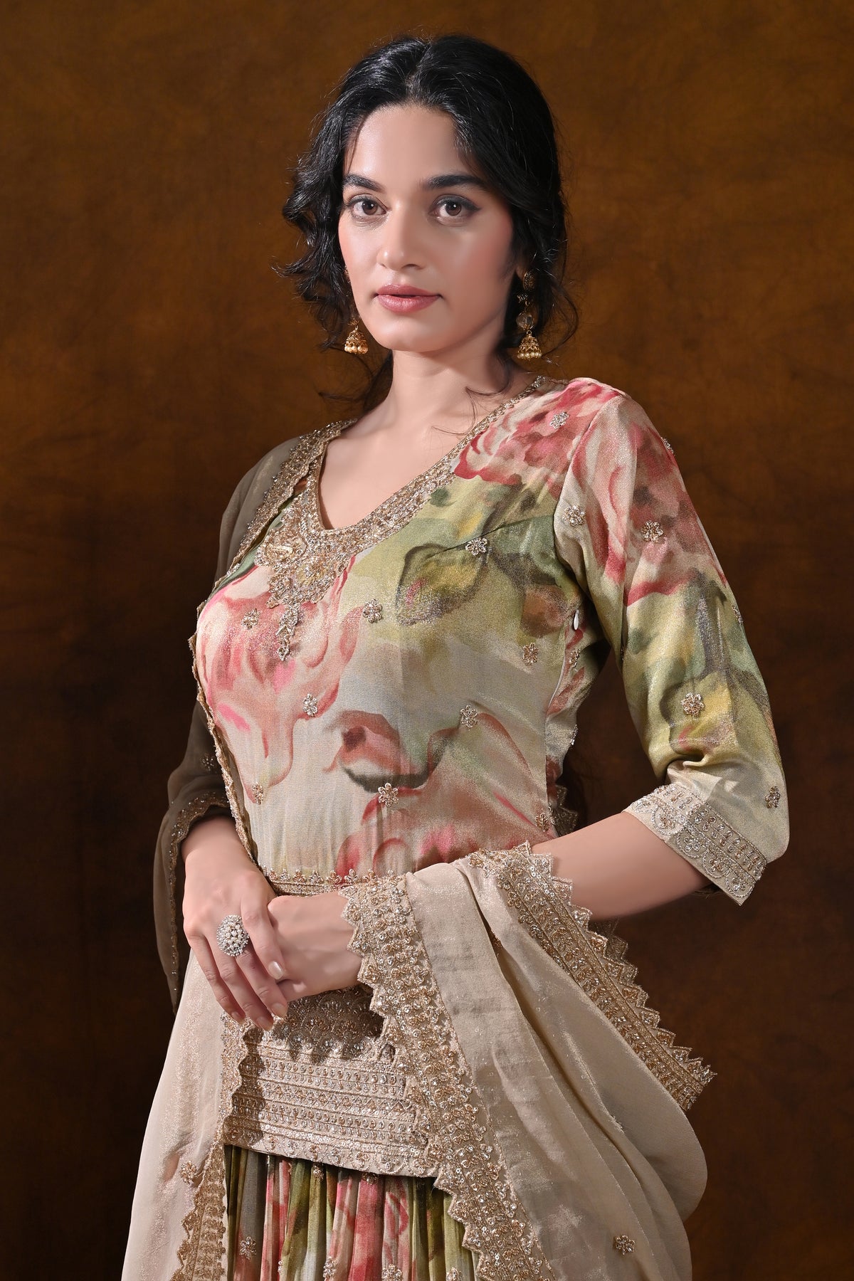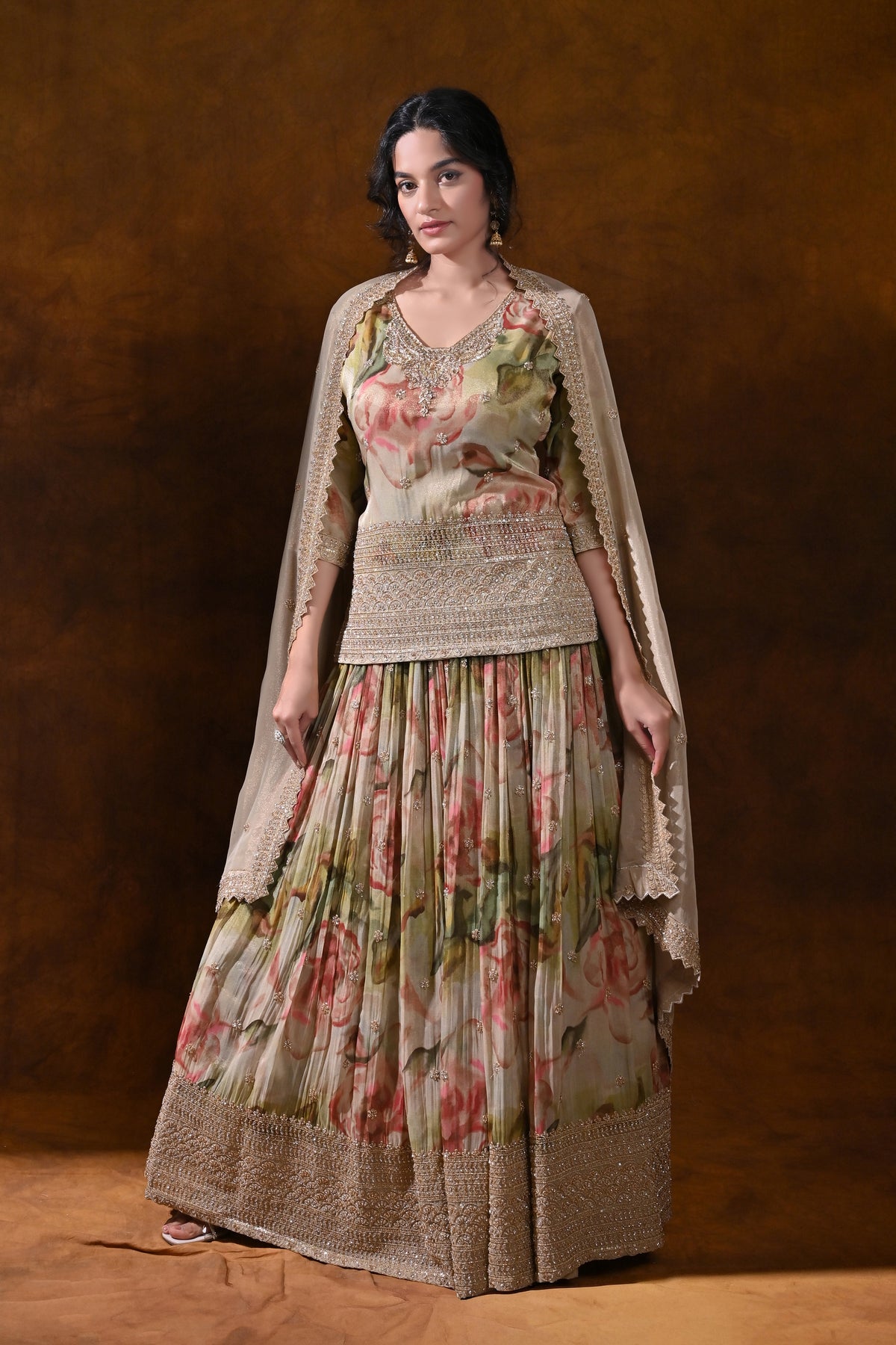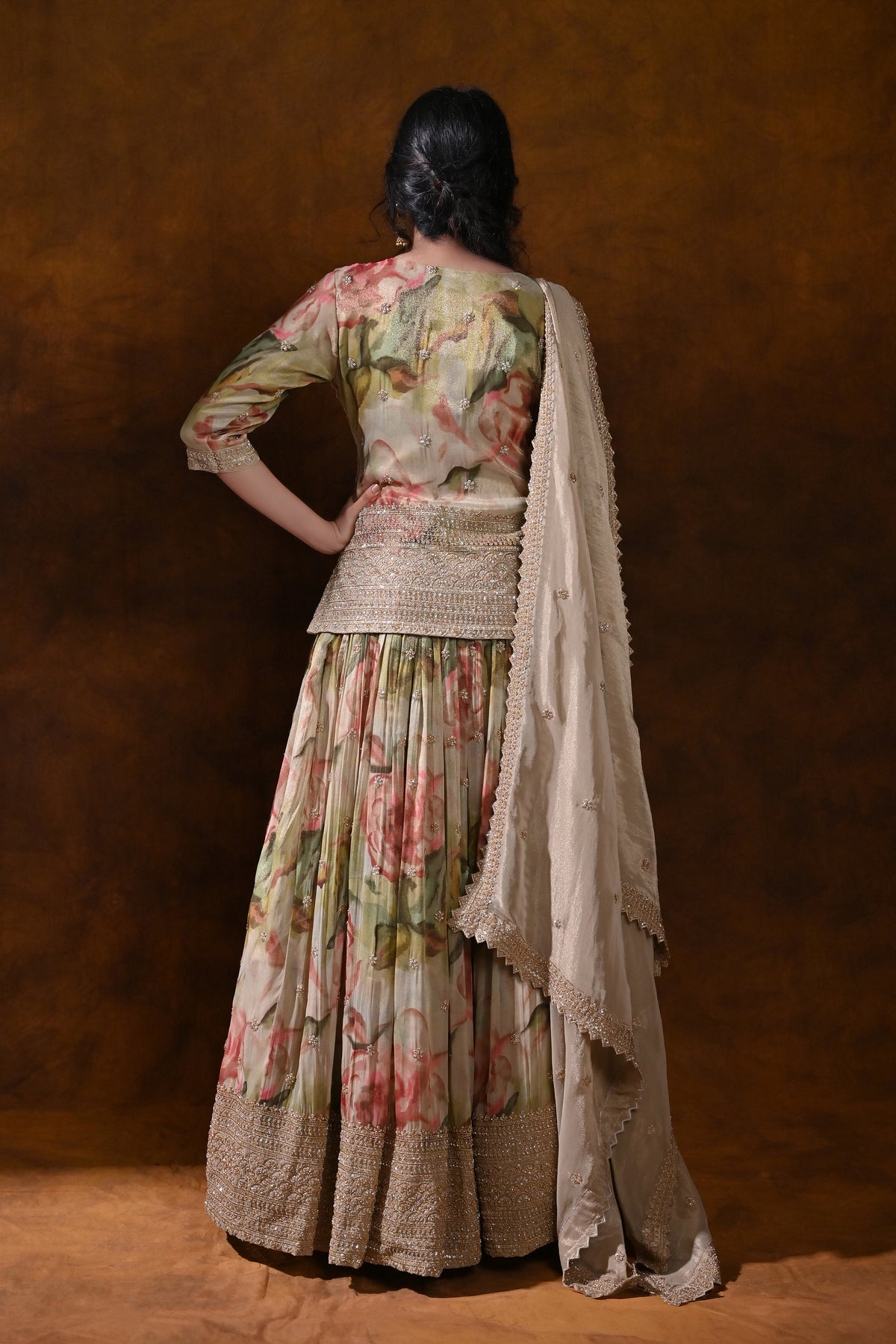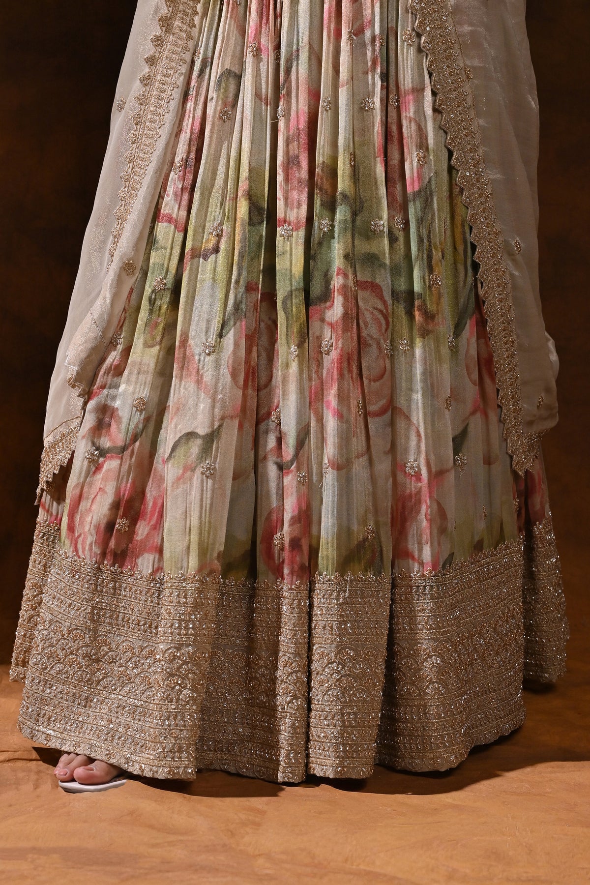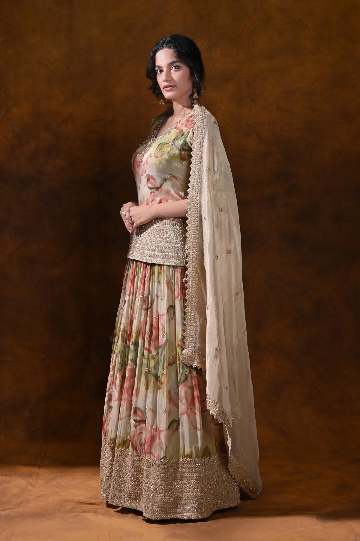 - Fabric & Finish: Pastel olive silk with a soft floral print, crafted to drape beautifully and maintain a graceful fall through the event season.