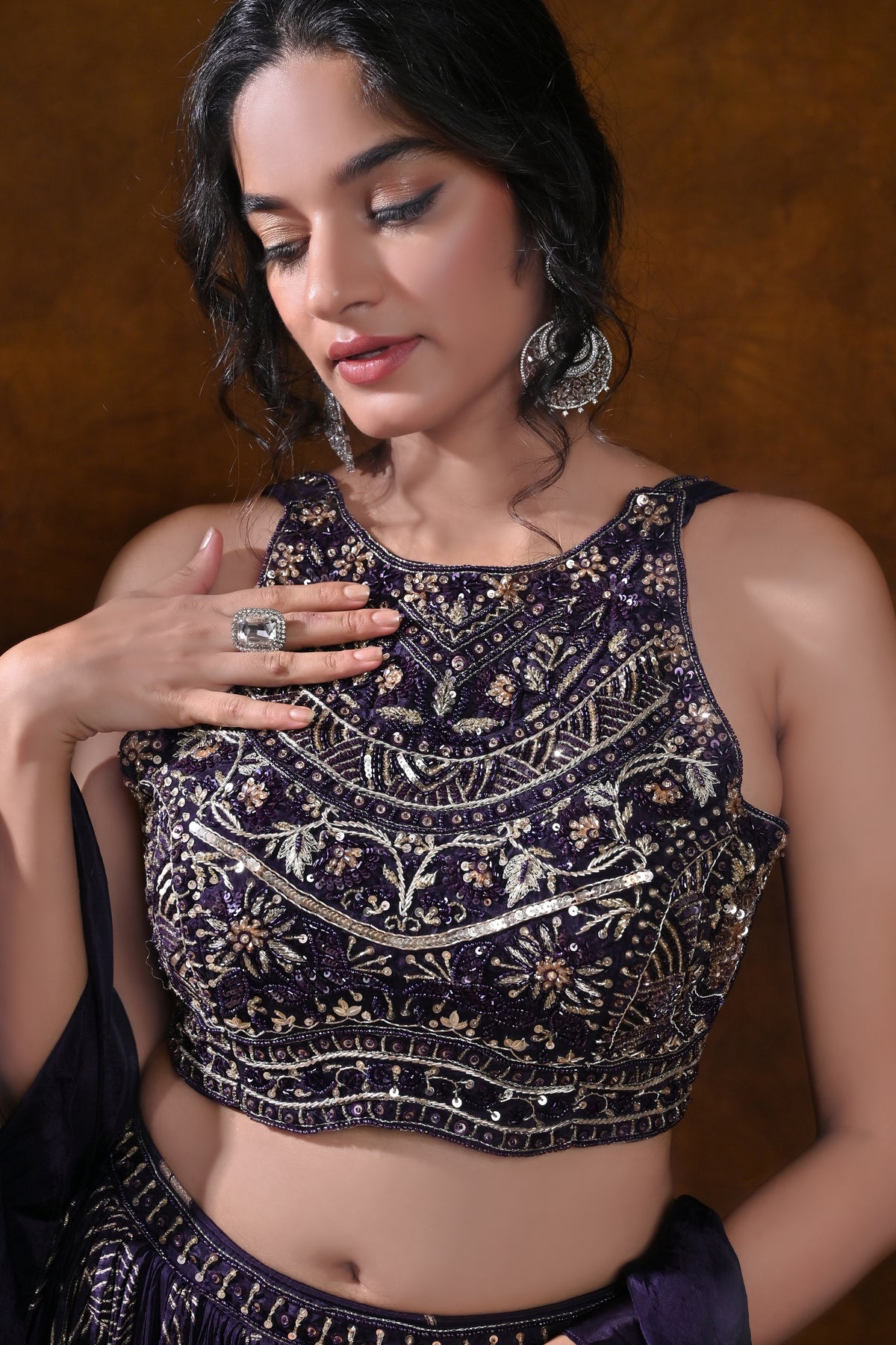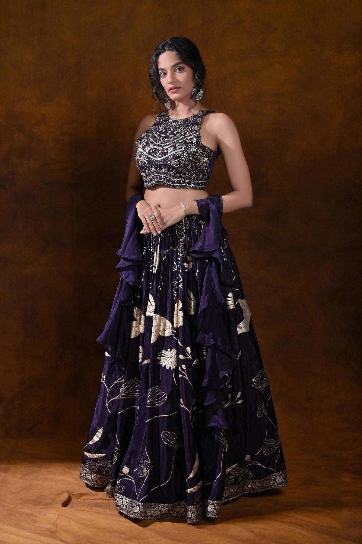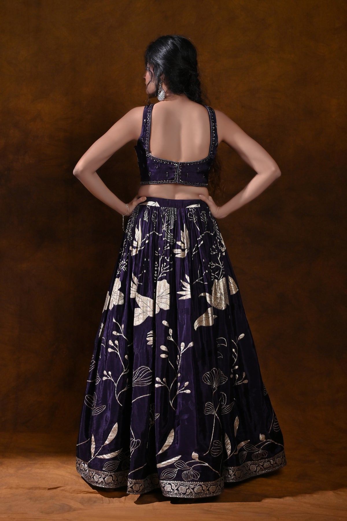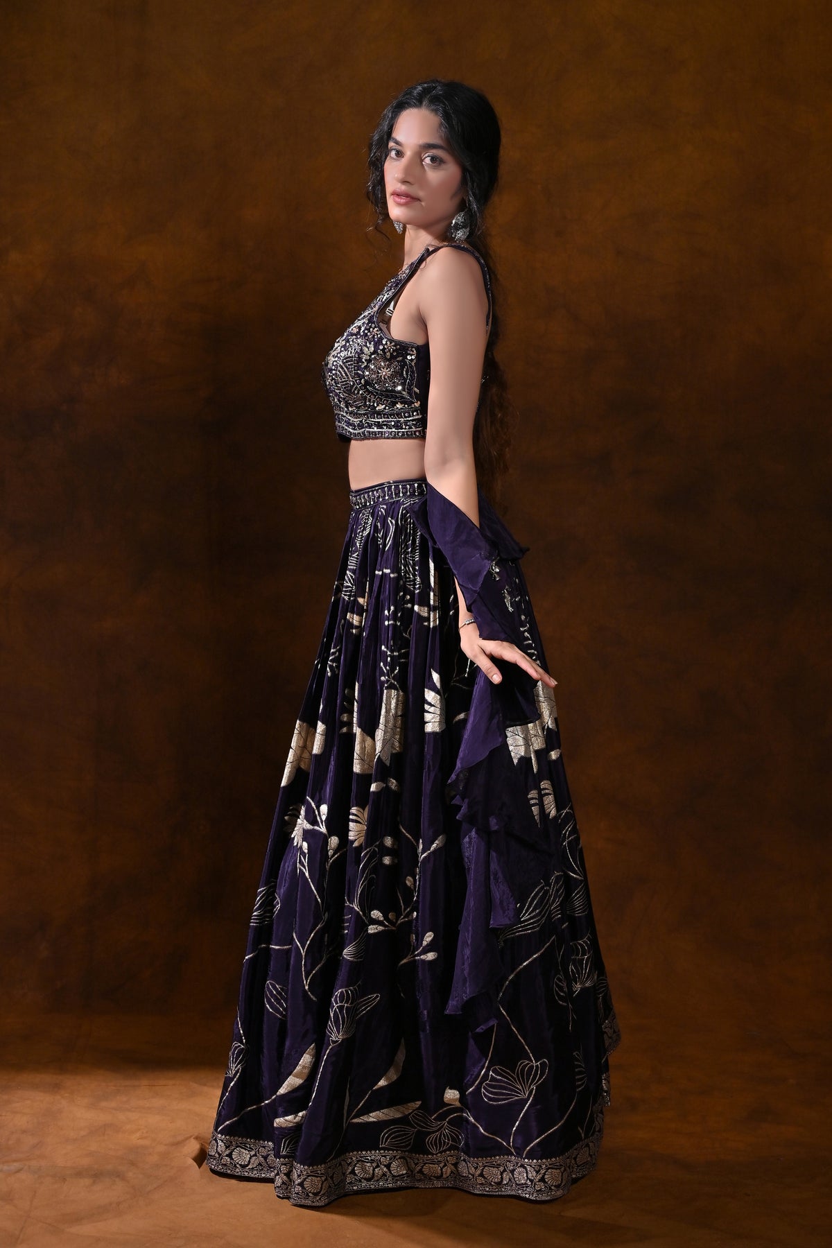 This lehenga choli delivers a show-stopping silhouette without compromising on wearability. The regal purple shade flatters a range of skin tones, while the metallic embroidery adds a premium glow under evening event lighting. The multi-layered skirt provides dramatic movement for photos and first-dance moments, and the heavily embroidered blouse draws the eye to the neckline and jewelry, ensuring a cohesive, luxurious ceremonial look. Perfect for making a memorable entrance, this ensemble pairs beautifully with statement earrings, bangles, and a coordinating dupatta for a complete wedding-ready appearance.