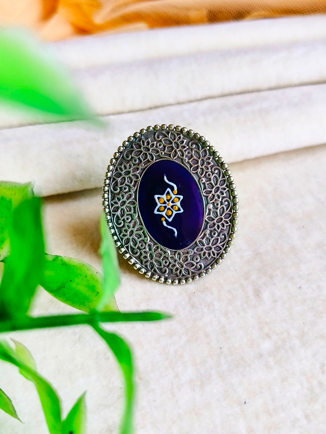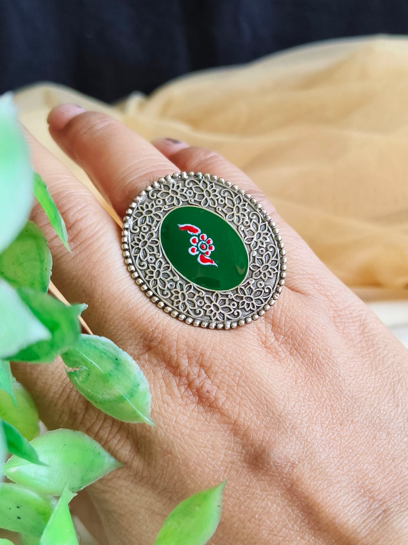 Add elegance to your collection with this oxidized silver-plated ring featuring a beautiful floral design around a vibrant stone accent. Crafted from high-quality, nickel, lead, and cadmium-free brass, this ring is plated with 925 silver and finished with a matte oxidized look. The intricate detailing and vintage appeal make it ideal for Navratri, Garbha, or any festive occasion. This versatile ring can be paired with both formal, casual, and Western outfits.
