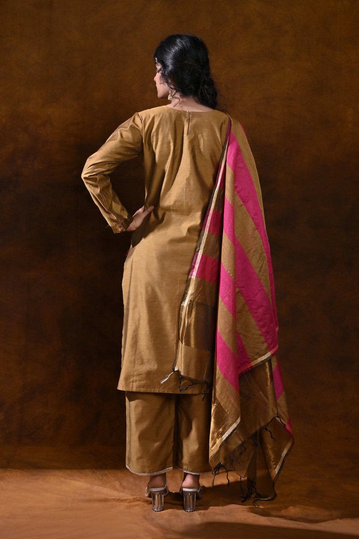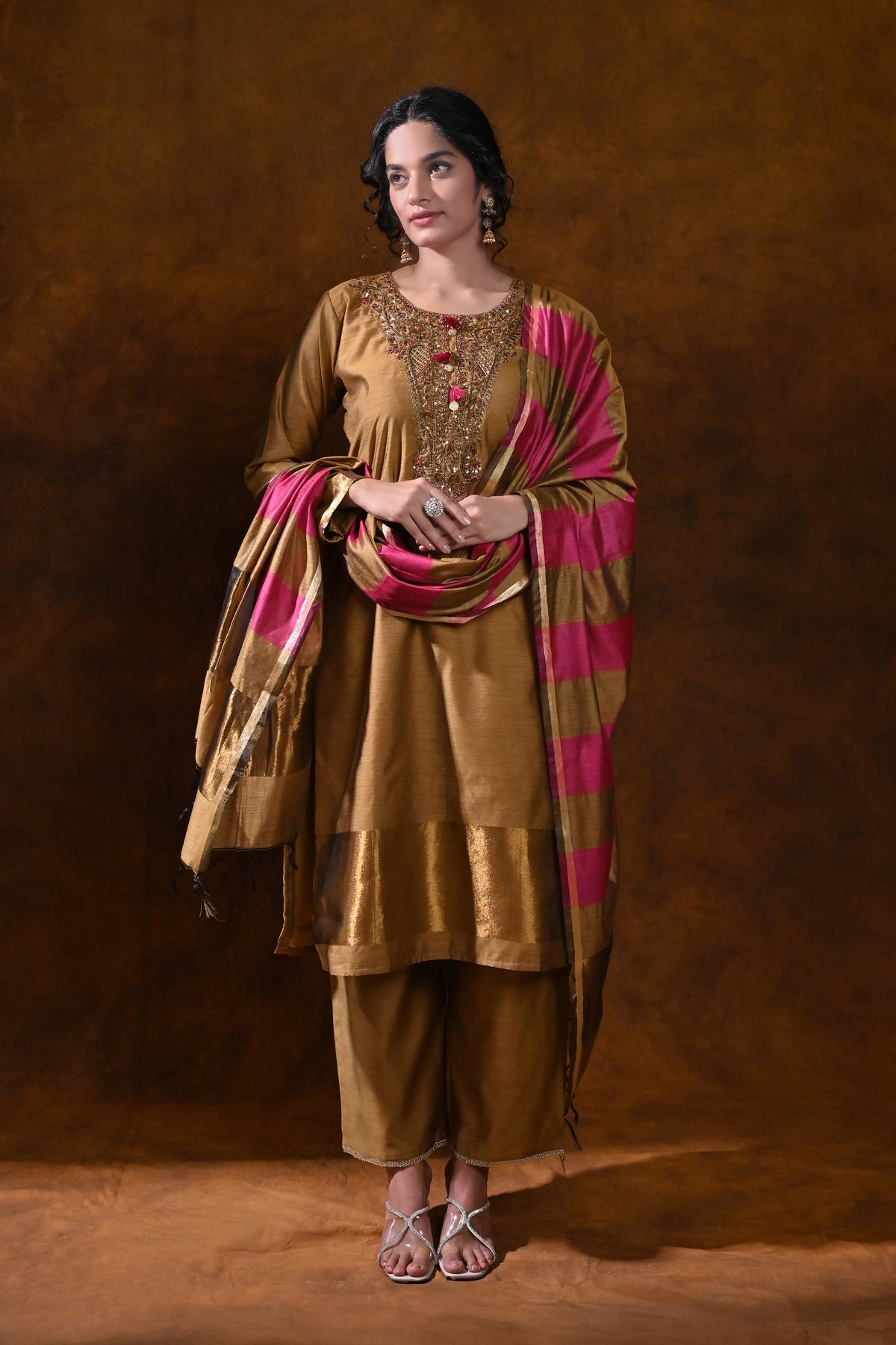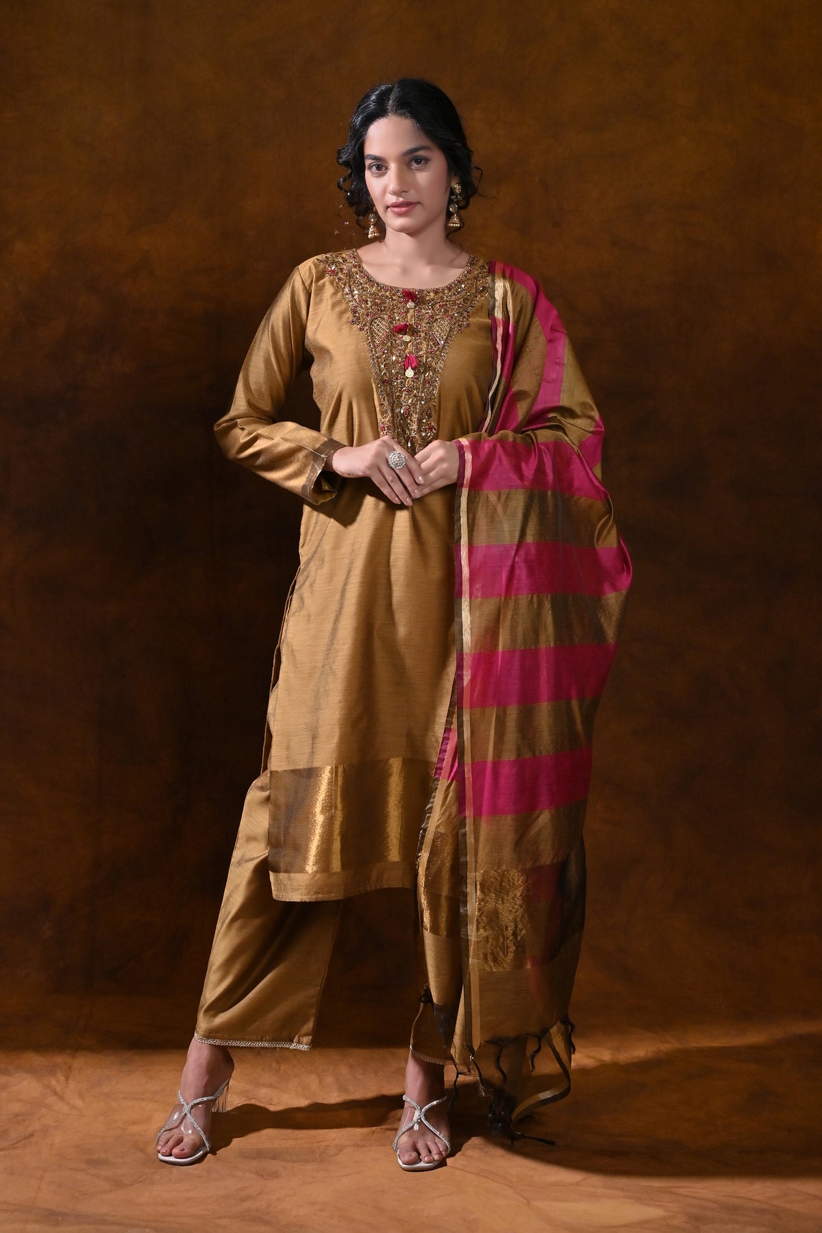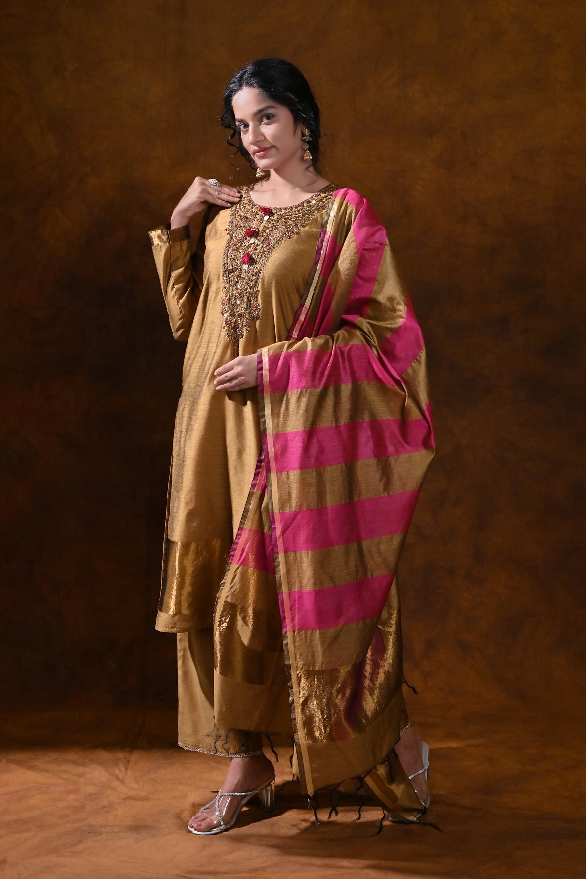- Dupatta: Magenta scarf with coordinating stripes and a delicate gold border for a striking, coordinated contrast.