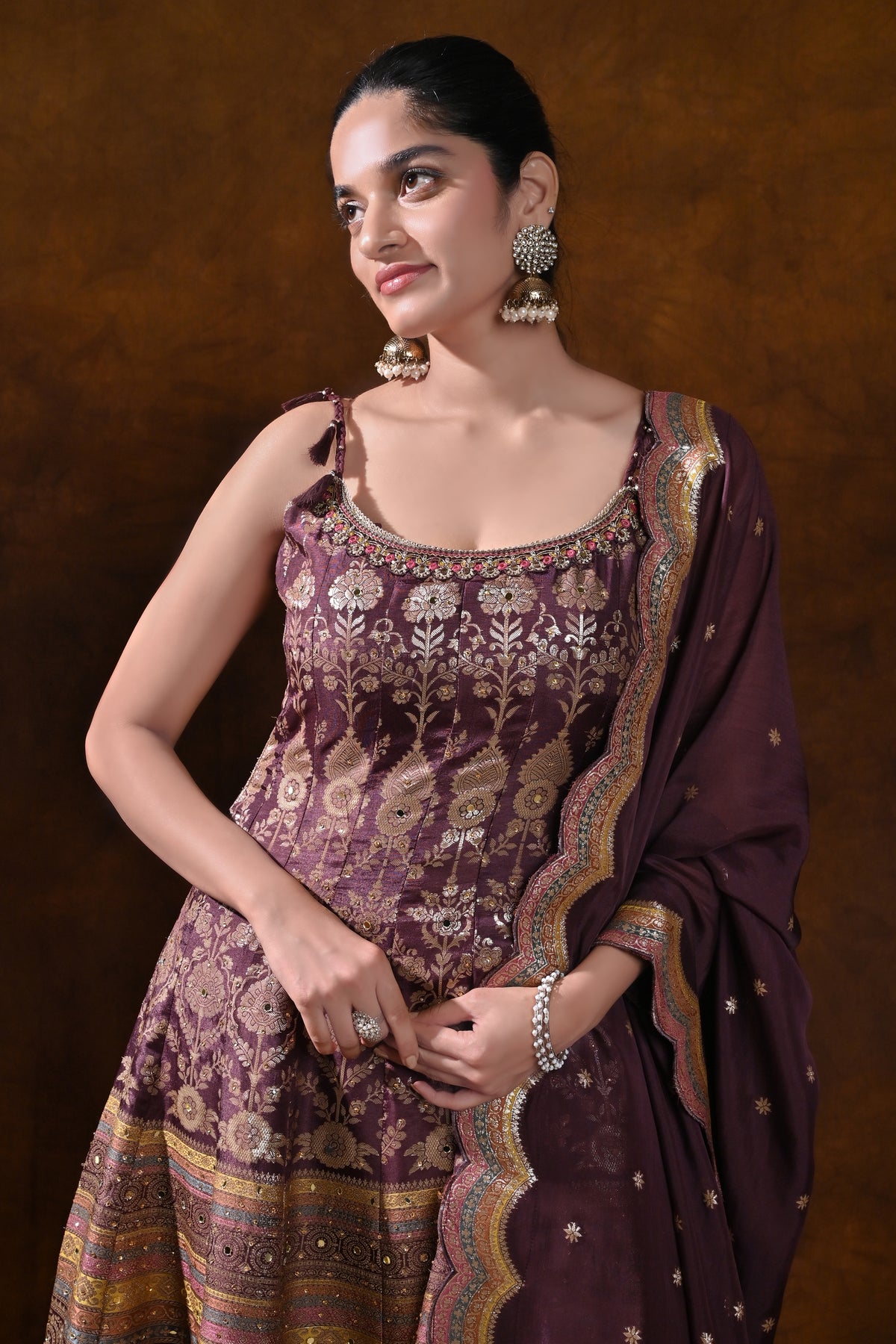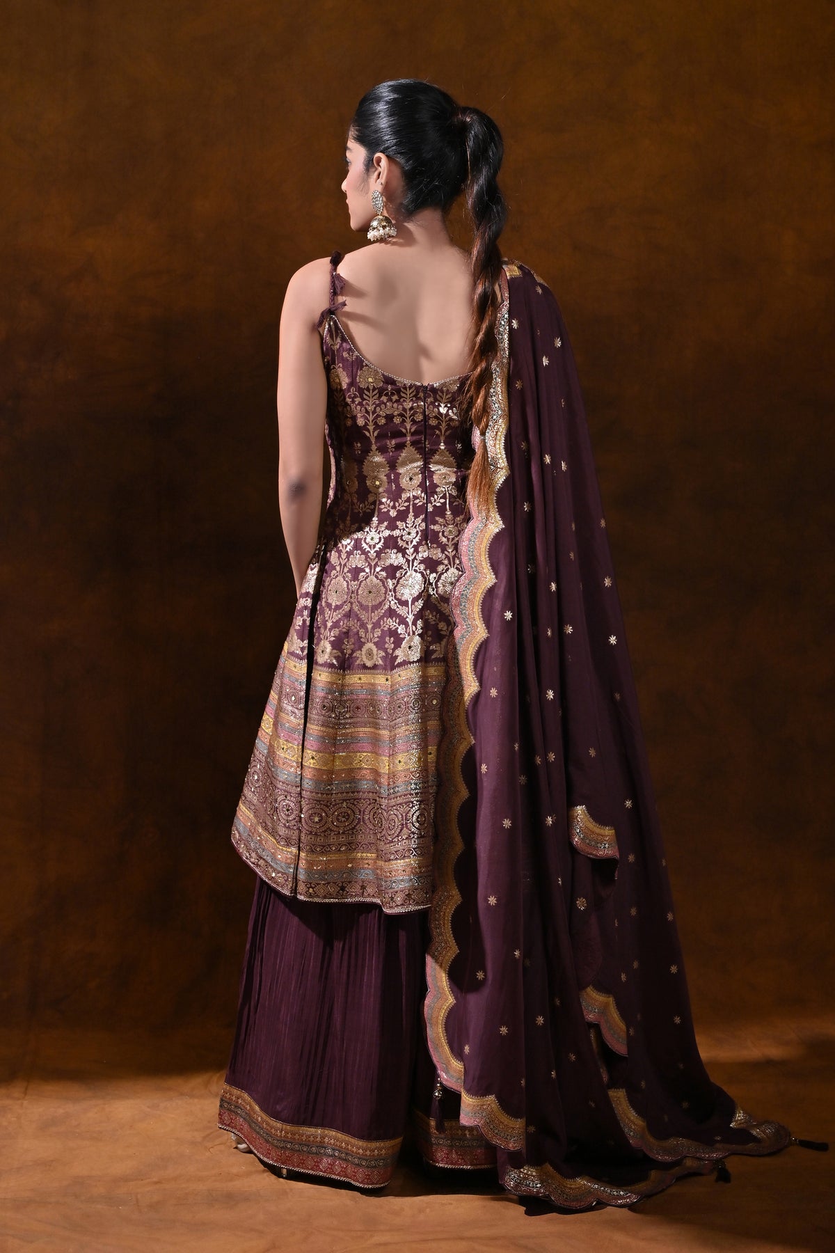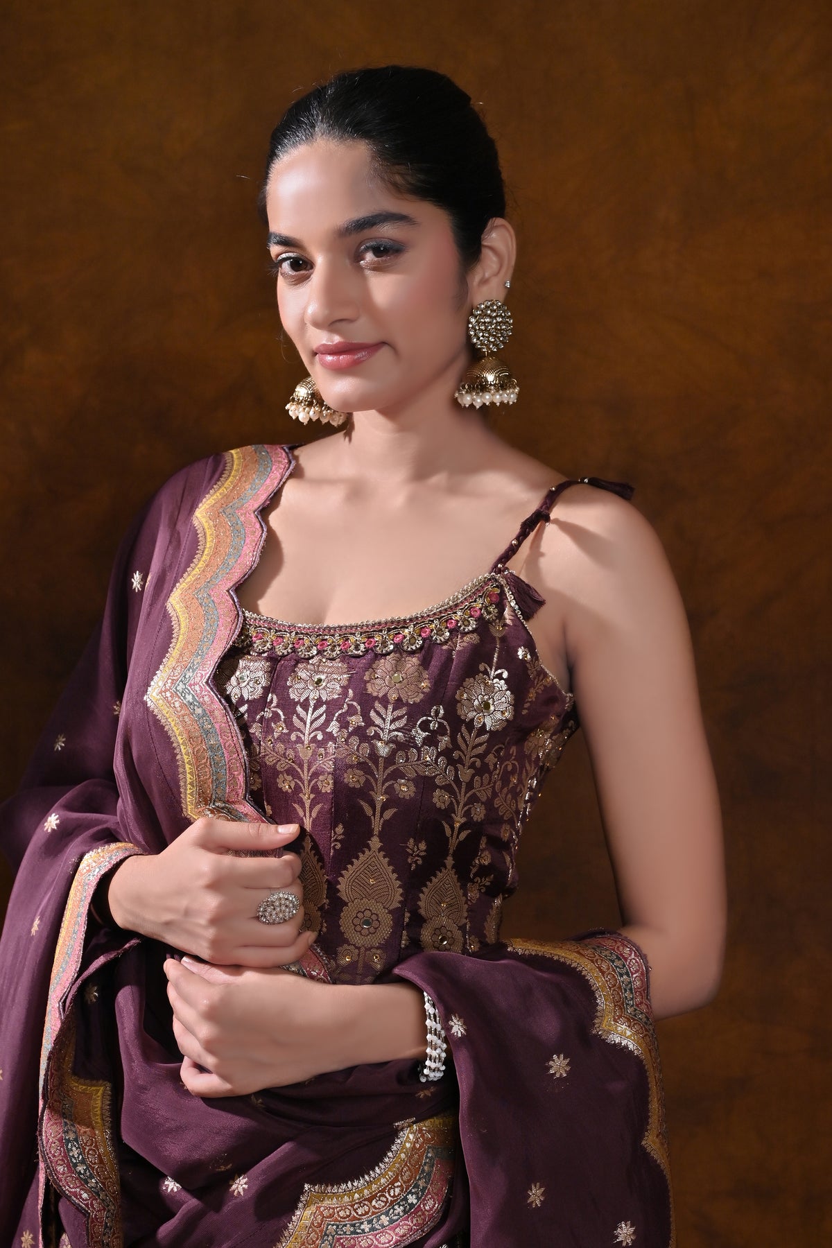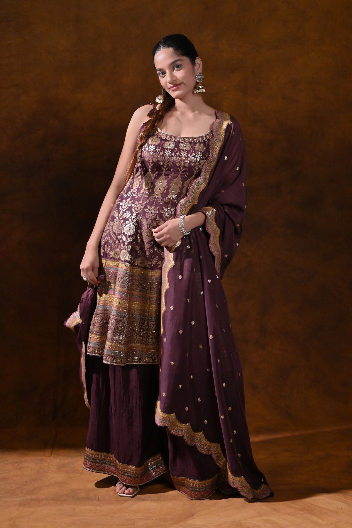 A luxurious plum silk brocade salwar suit designed for weddings and festive occasions. This traditional ensemble pairs rich fabric with intricate gold zari embroidery to deliver a timeless, camera-ready silhouette.