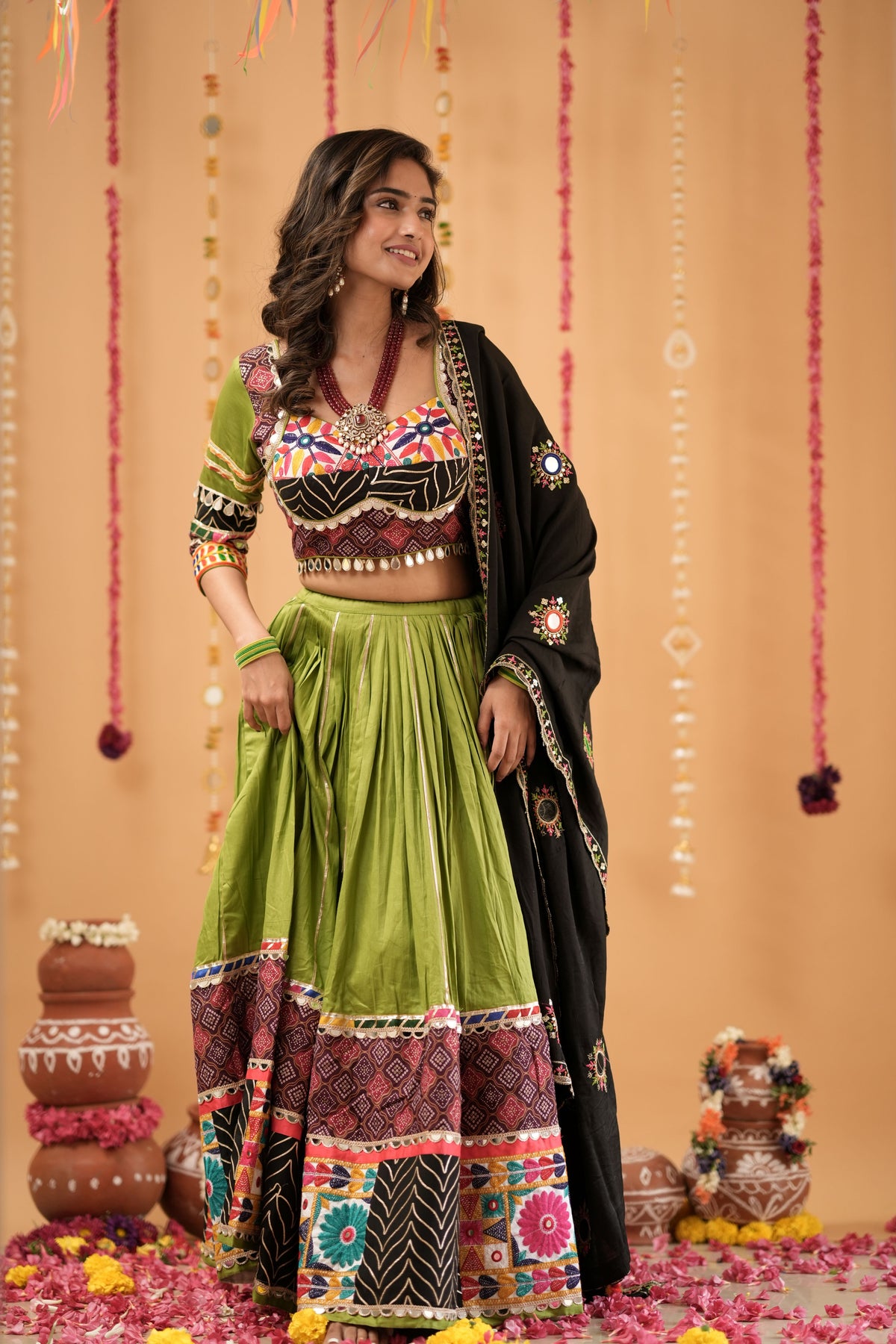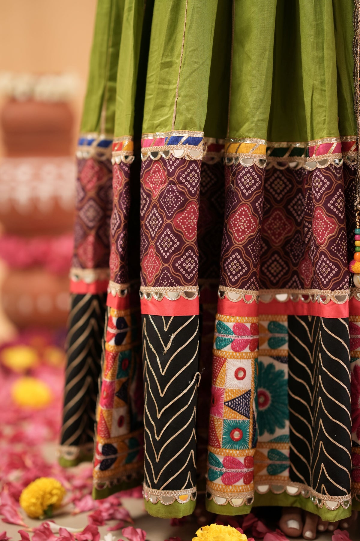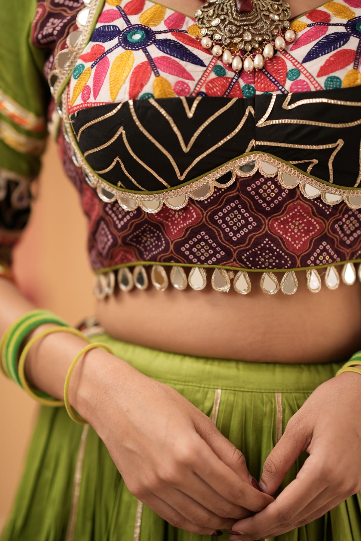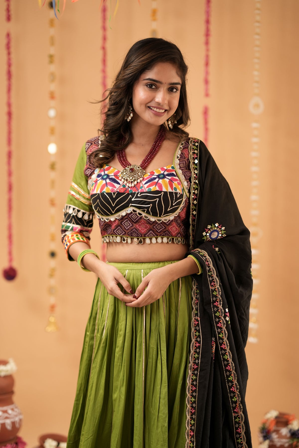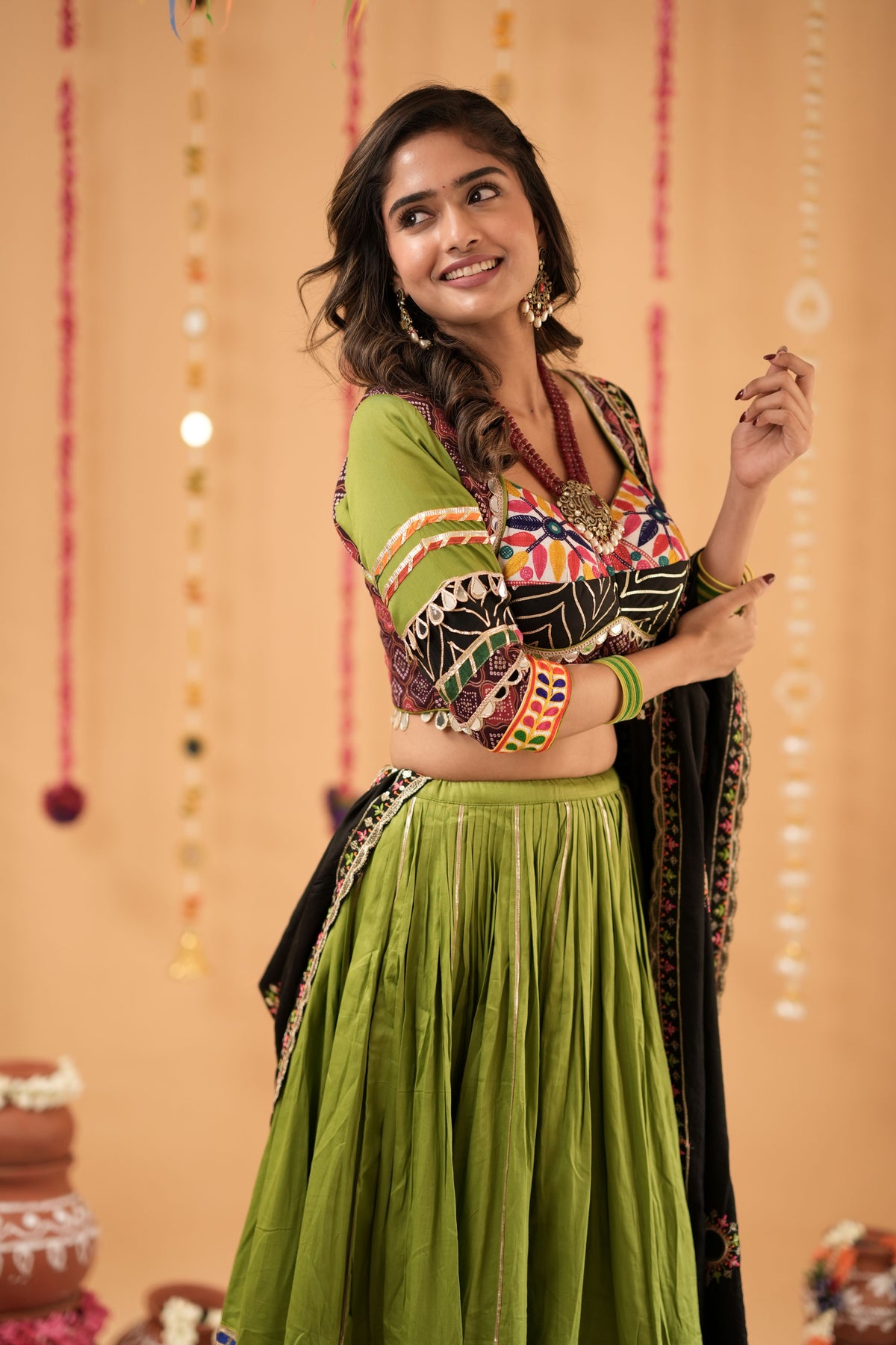 This green lehenga is designed with a wide multicolor patchwork border and comes with a mirror-embellished blouse and contrast dupatta. Perfect for Garba and festive nights.
