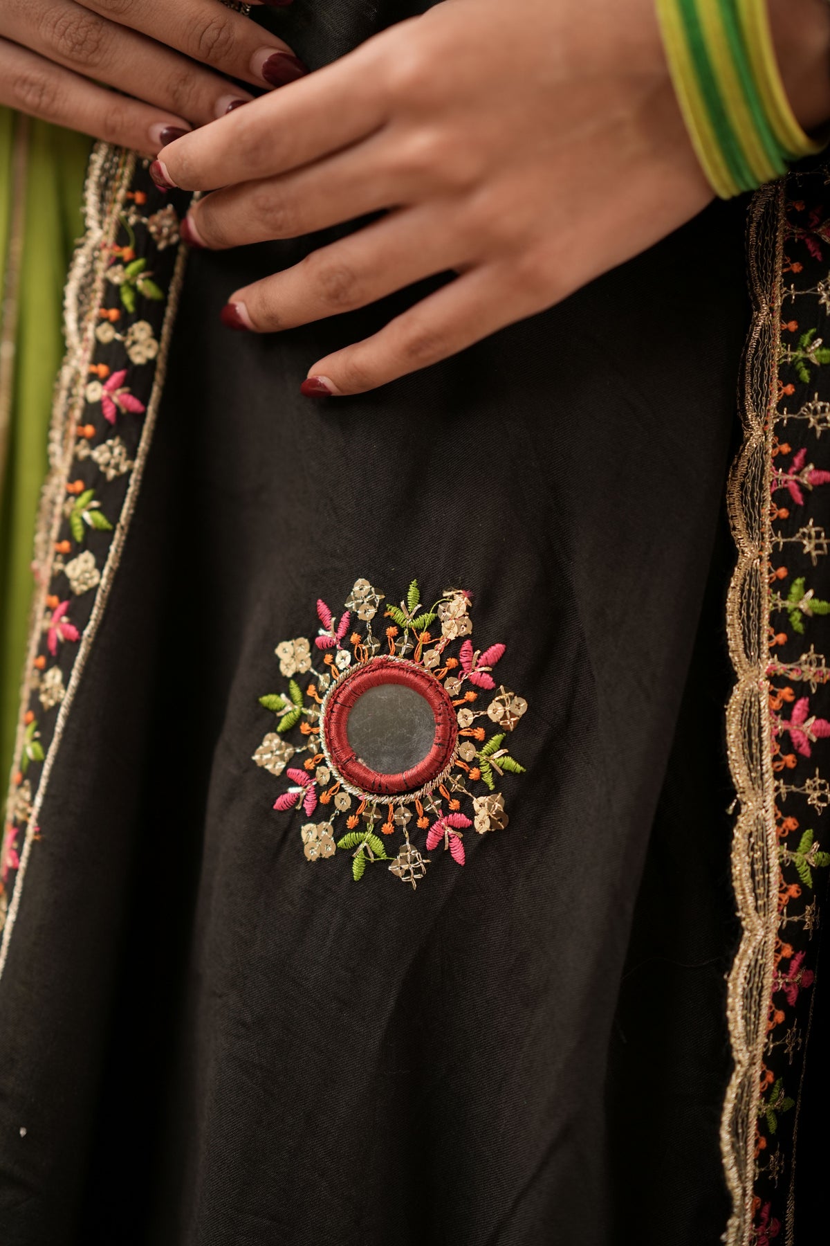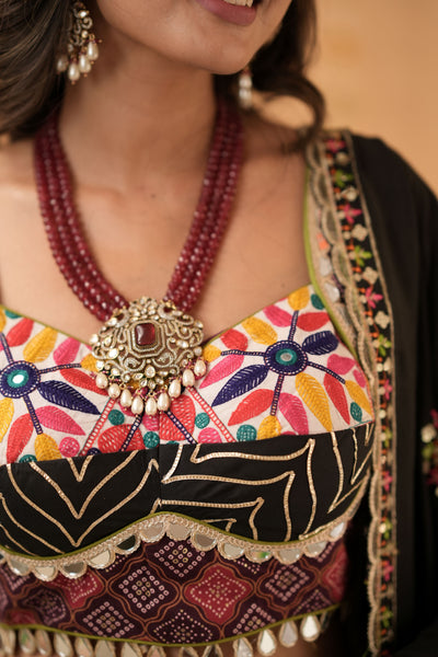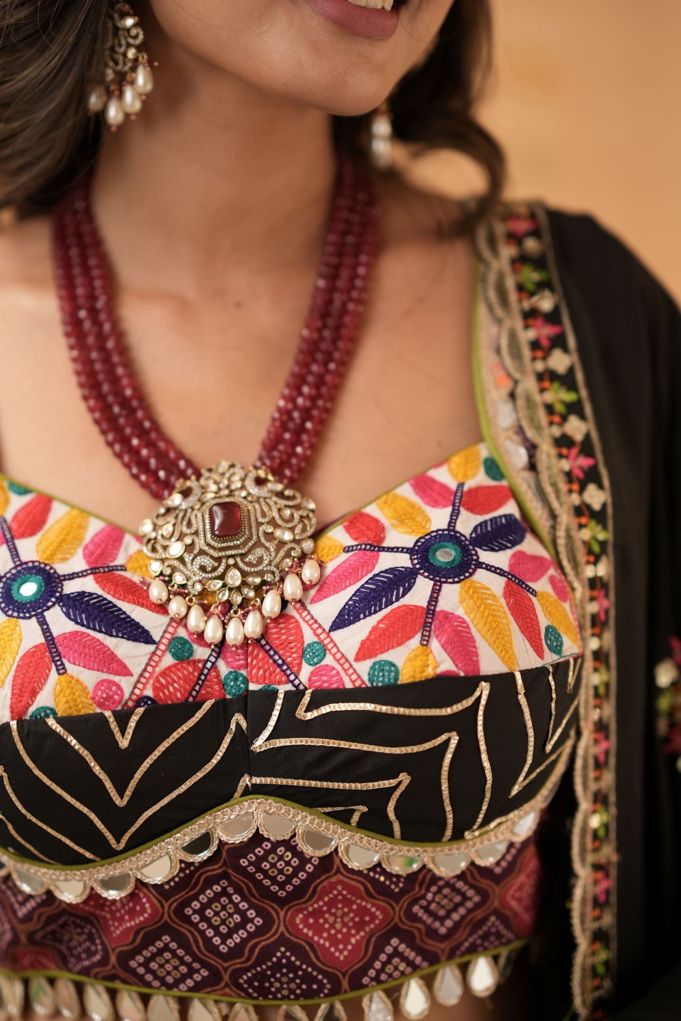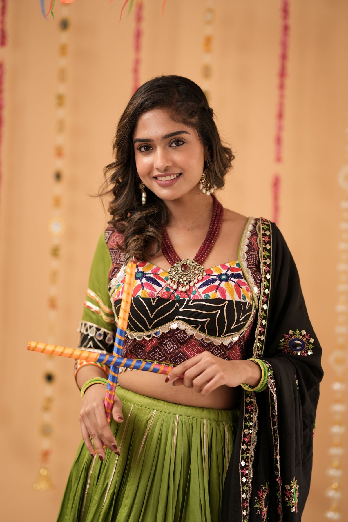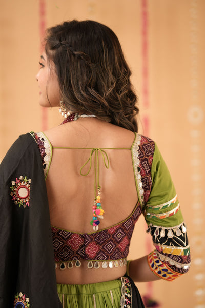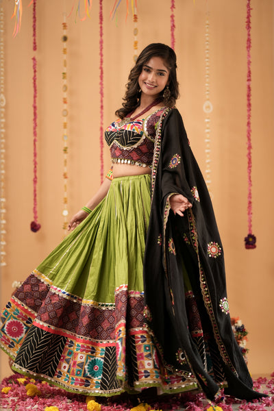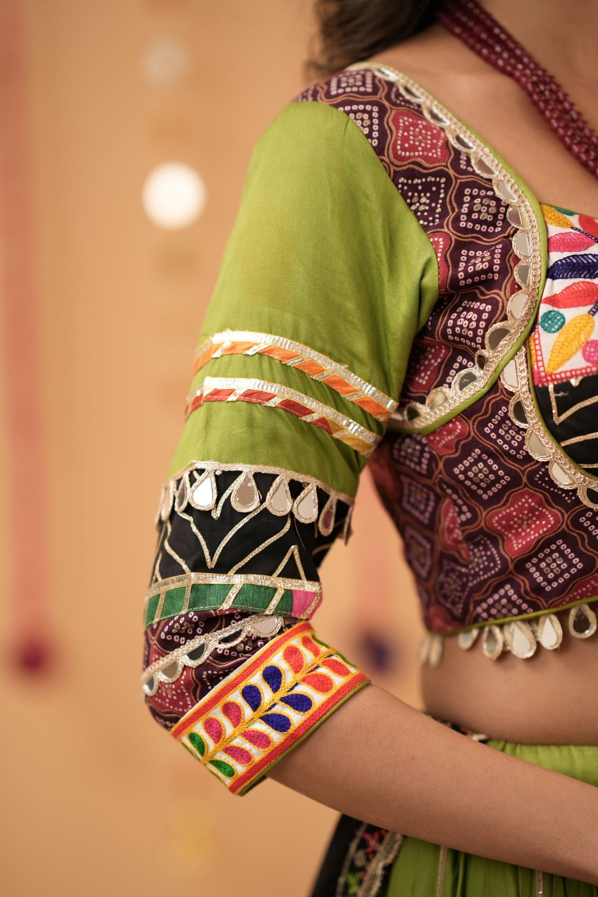 This green lehenga is designed with a wide multicolor patchwork border and comes with a mirror-embellished blouse and contrast dupatta. Perfect for Garba and festive nights.