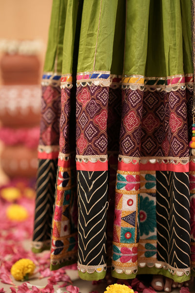 Green Navratri Lehenga with Multicolor Patchwork Border