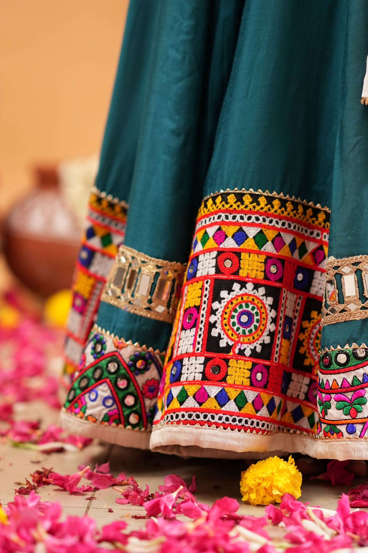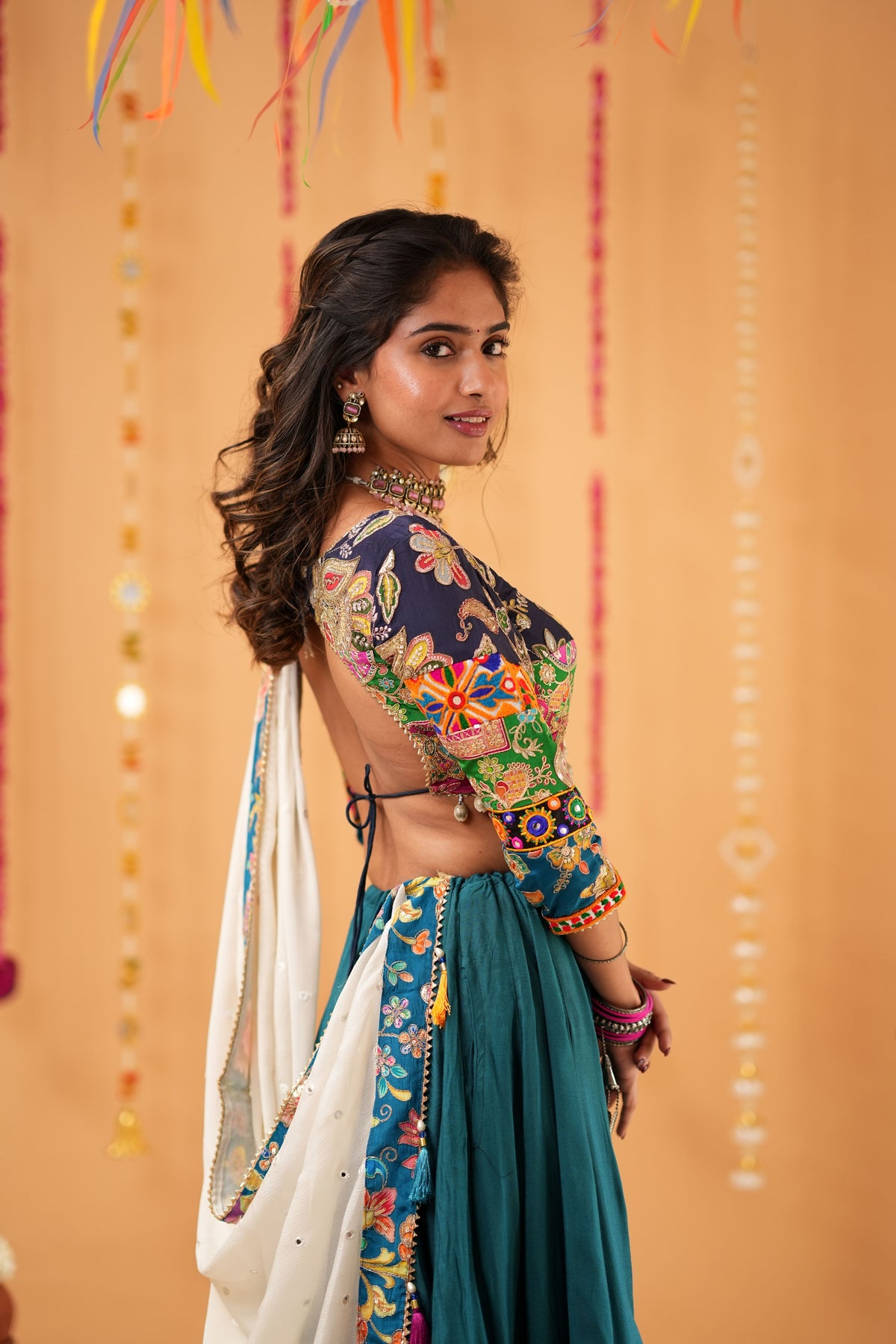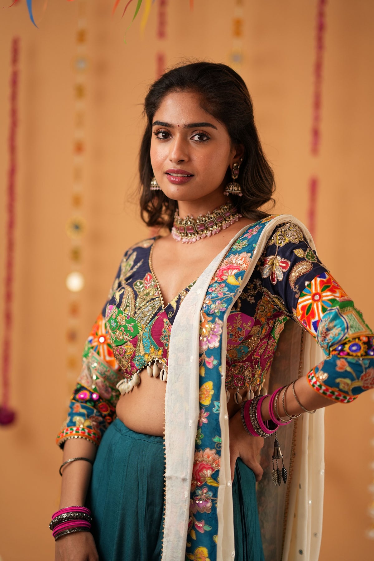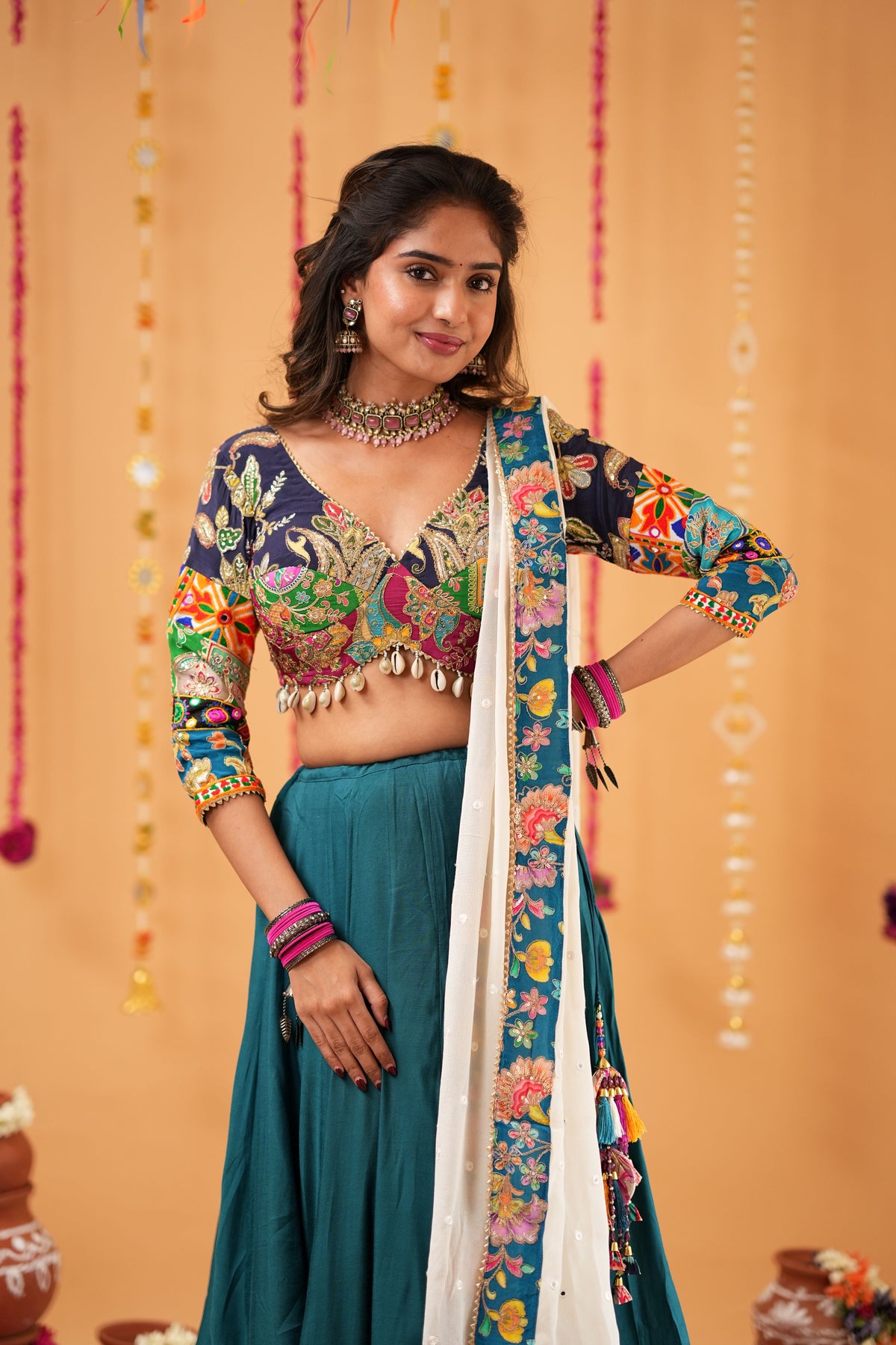 A teal flared lehenga styled with a multicolor embroidered blouse and a white dupatta. Mirror accents add a festive sparkle to this set.