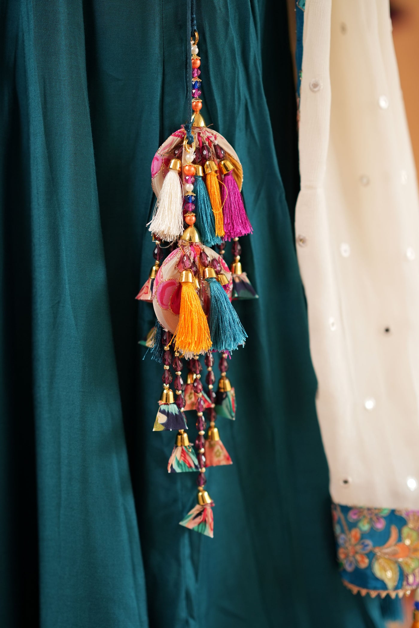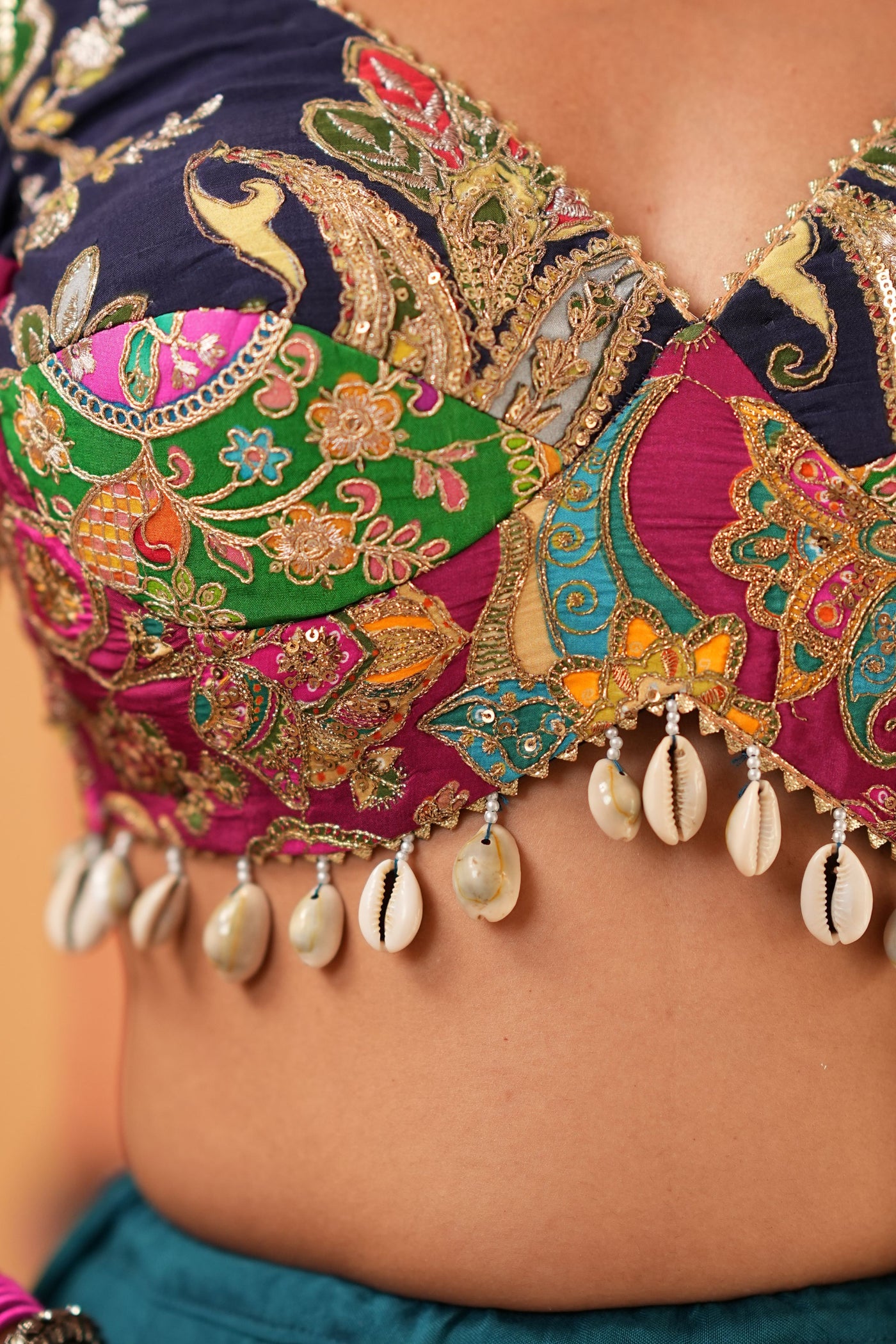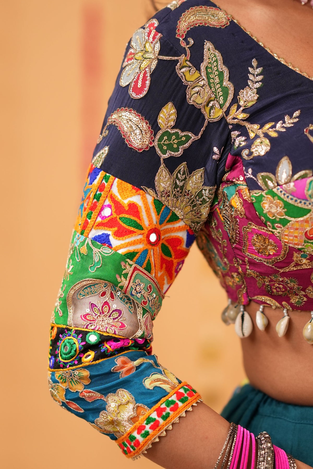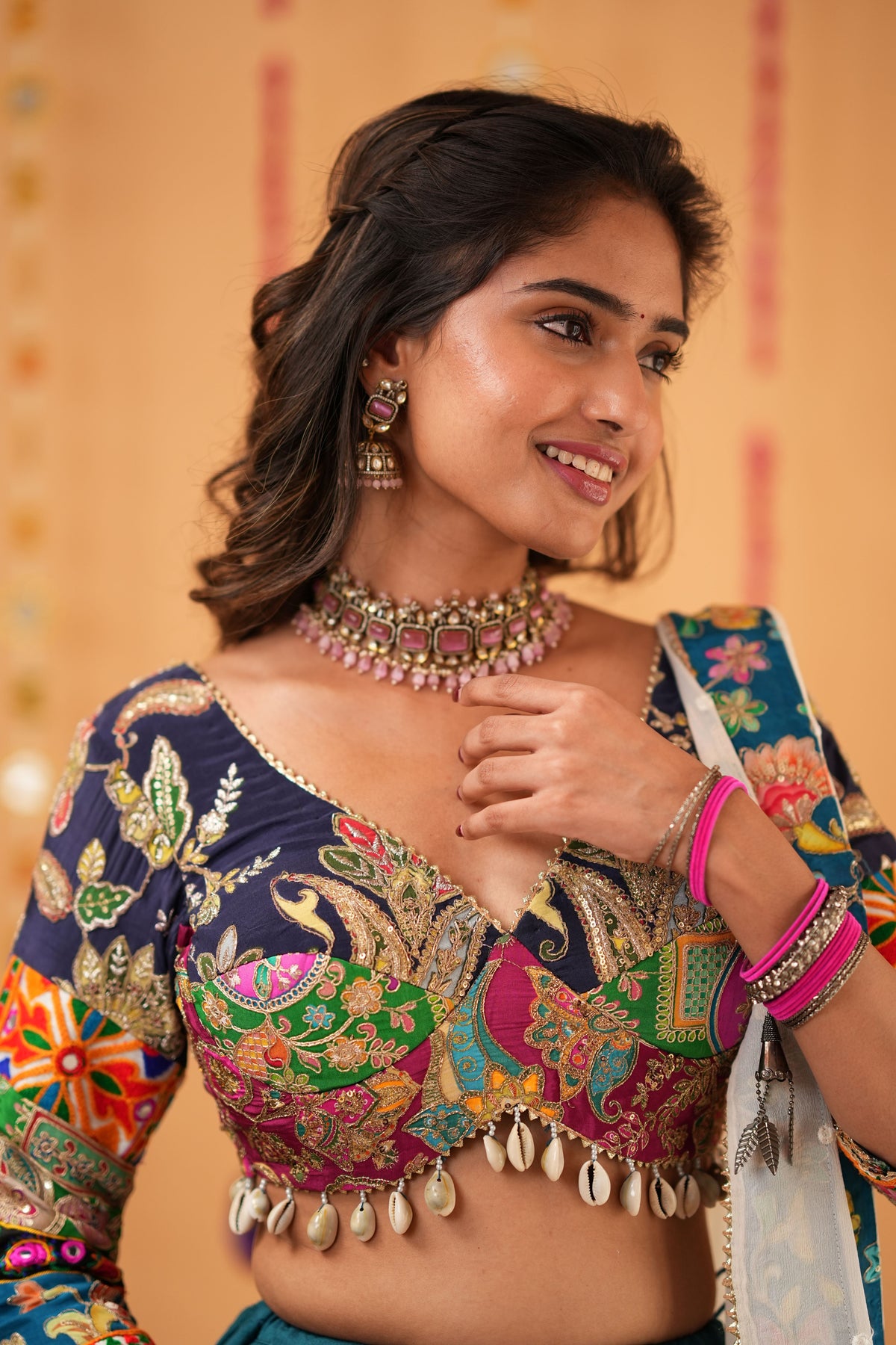 A teal flared lehenga styled with a multicolor embroidered blouse and a white dupatta. Mirror accents add a festive sparkle to this set.